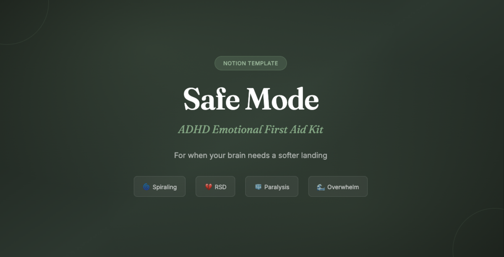 Safe Mode is an emotional first aid kit β a Notion template with gentle protocols designed to meet you exactly where you are, even when that's "I literally cannot function right now."